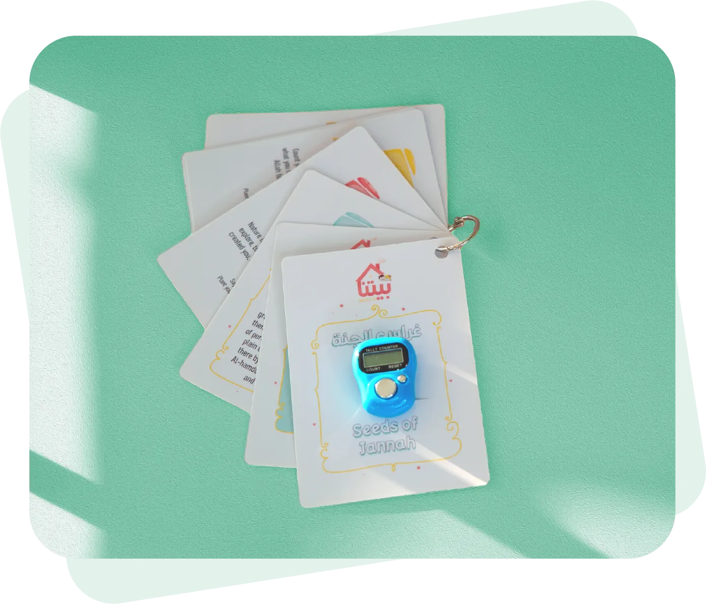 نــشـــاط مصـمـم للأطـفـــال مـن ســن 5 سـنــوات إلى 10 ســنــوات. تـربـط البطاقـات الطفـل بالأذكـار في حيـاتـه اليوميـة ليتعـرف من خلالها على الأذكار والتسبيح، يأتي مـع البطاقات سبحـة إلكـتـرونيـة كـمـا يأتـي معـهـا دليـل تطبيـق بـه مجموعـة من الأفكـار المتـدرجة لكل مـرحـلة عمريــة ليساعـد الأم عـلى توصيل معلومـات غيبيـة وحياتية متعددة